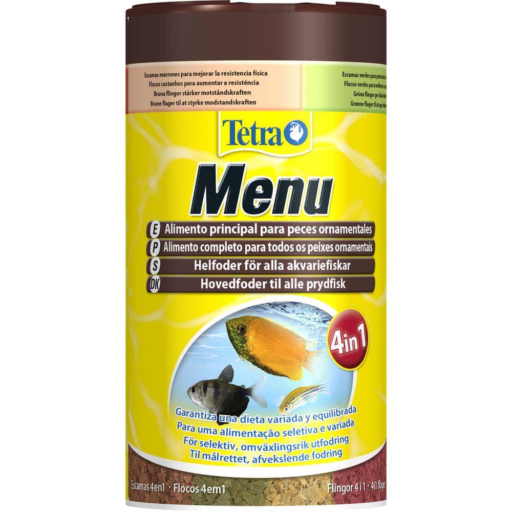 Tetra Meny Fôrmix har fire forskjellige flakfôr i separate kammer for morsommere fôring .