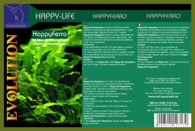 Happy-Life Ferro er en høykonsentrert, universell jernkilde for alle akvarieplanter. I tillegg til det essensielle næringsstoffet jern (Fe2+), inneholder det også andre viktige næringsstoffer som kalium og magnesium samt en lang rekke andre næringsstoffer. Løsningen er multistabilisert og inneholder verken nitrat eller fosfor.