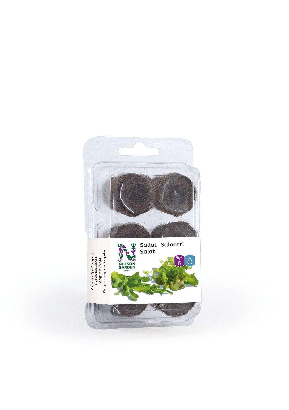 6 planteplugger, av kokosfiber og torv pluss litt næring, forhåndssådde med salat. Passer til hydroponisk dyrking, d.v.s. dyrking i vann.