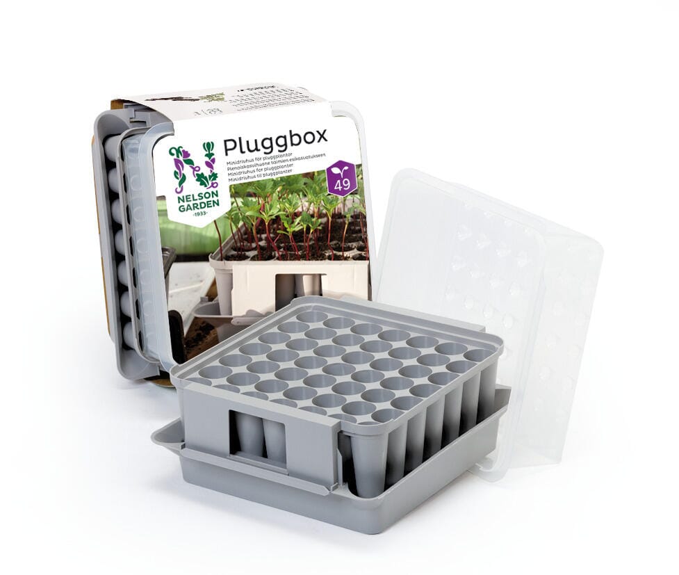 Pluggboxen er et kompakt minidrivhus som gjør det mulig å forkultivere 49 pluggplanter med dype og velutviklede rotsystemer – ideelle for å plante ut i potte, balkongkasse, eller i blomsterbed. Pluggboxen består av tre deler: bunntrau, pluggdel, og lokk. Materialet er av høy kvalitet, og tåler oppvaskmaskin.