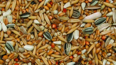 Sammansättning: Vete, Havre, Rent kanariefrö, Strimmigt solrosfrö, Safflorfrö, Gul hirs, Röd sorgum, Vit sorgum, Linfrö.