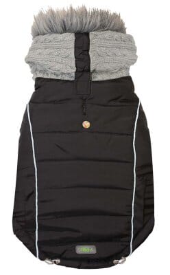 Kombinationsjacka med stickad kapuschong. Den här trendiga stilen har en stickad kapuschong med pälskant, reflexdetaljer och elastiska band för bra passform. gå ned en størrelse du vanligvis bruker.