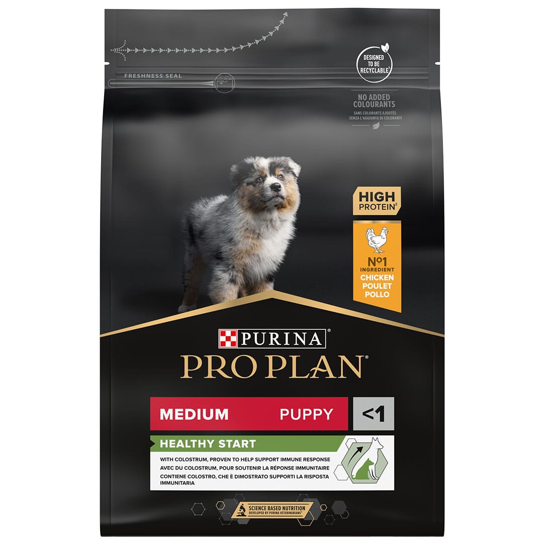Et komplett tørrfôr, vitenskapelig sammensatt for middels store valper. PURINA® PRO PLAN® Medium Puppy med OPTISTART® er et tørrfôr som inneholder alle de næringsstoffene valpen trenger for å vokse normalt. Det egner seg også til drektige eller diegivende tisper. Sammensetningen inneholder OPTISTART®, en blanding ingredienser som inkluderer råmelk – et næringsstoff fra den aller første morsmelken som hjelper til å støtte valpens immunforsvar. Fôret er rikt på kylling av høy kvalitet og er sammensatt av PURINA-eksperter for å fremme sterke tenner og ledd samt støtte allsidig, langvarig helse.