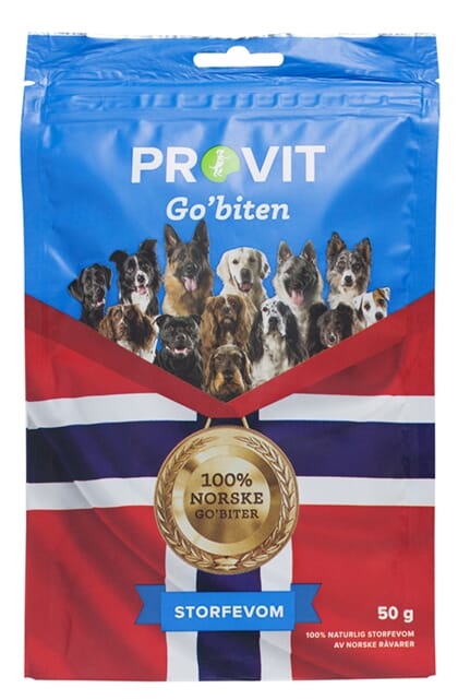 Provit Go’biten er rene, norske naturprodukter uten noen form for tilsetninger. Dette gir trygge og naturlige godbiter til kos, trening og belønning av hunden. Go’biten Storfevom er produsert av norsk storfe og frysetørket. Frysetørking bevarer råvarens kvalitet, smak, næringsinnhold, mineraler og vitaminer.
