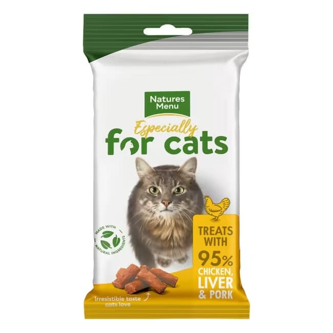 Natures Menu kjøttfulle godbiter er den ultimate godbit. Laget med 95% kylling, lever og velsmakende svinekjøtt. En uimotståelig snacks for katter som ikke inneholder gluten.