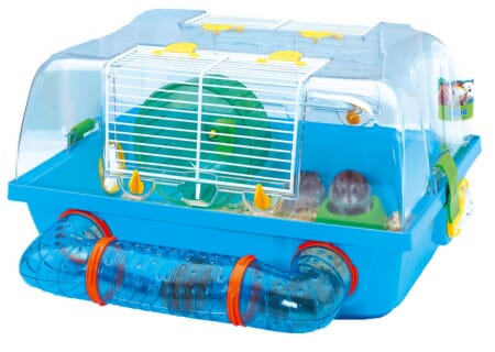 Med vannflaske, matskål, tunell og hamsterhjul.